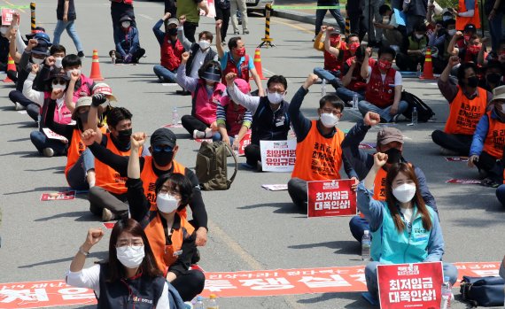 민주노총이 최저임금위원회 제2차 전원회의에 앞서 최저임금 대폭 인상을 촉구하고 있다.뉴스1 |