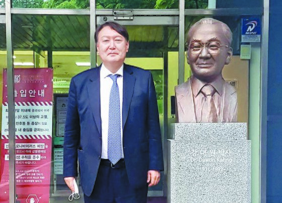 윤석열 전 검찰총장이 17일 서울대 반도체공동 연구소를 방문해 반도체 학자인 고(故) 강대원 박사 흉상 옆에서 기념촬영을 하고 있다. [뉴스1] |
