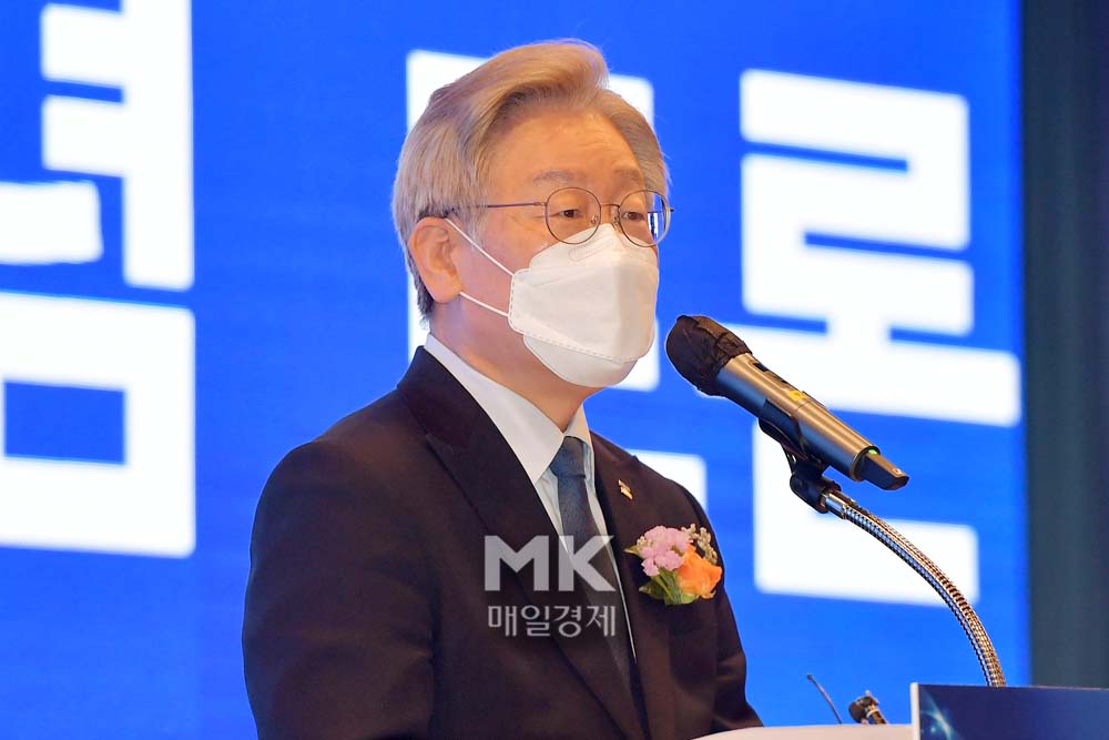 이재명 경기도지사가 20일 서울 여의도 중소기업중앙회에서 열린 `대한민국 성장과 공정을 위한 국회 포럼 출범식`에서 축사를 하고 있다. 2021.5.20. 한주형기자 |