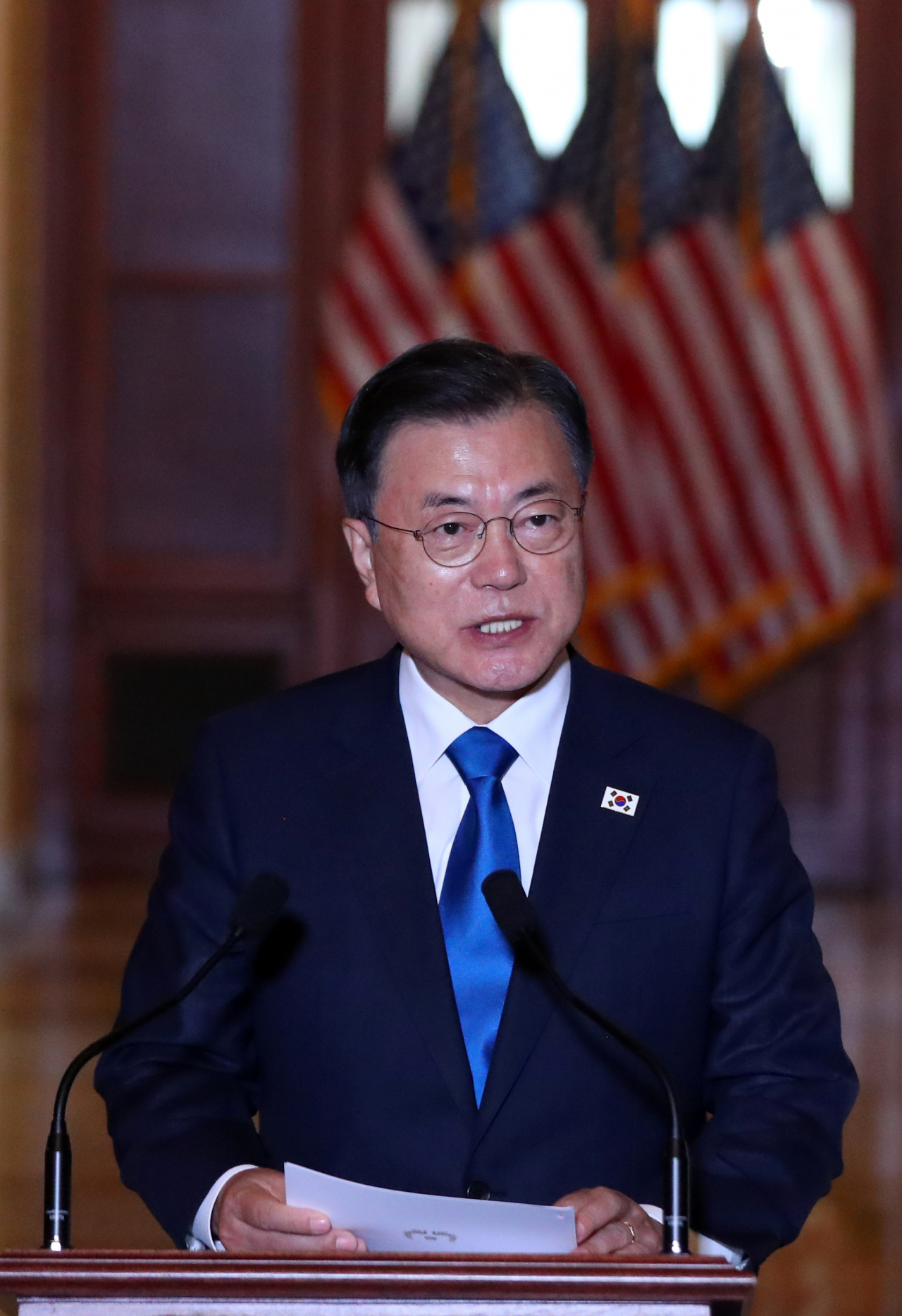 미국을 방문 중인 문재인 대통령이 20일 오후(현지시간) 워싱턴 국회의사당에서 미국 연방하원의원 지도부와 간담회에 앞서 발언하고 있다. [연합] |