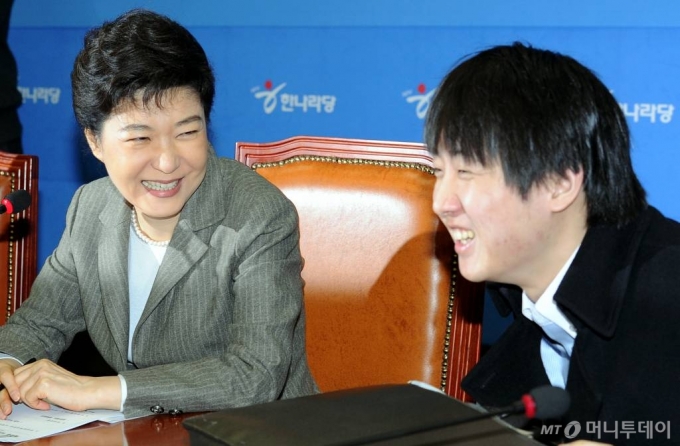박근혜 전 대통령은 2011년 한나라당 비상대책위원장을 맡았던 당시 27살 이준석 전 국민의힘 최고위원을 비대위원으로 발탁했다. 당시 비대위원 회의에서 박 위원장과 이 위원이 이야기하며 웃고 있다. 2012.1.19./사진제공=뉴스1 /사진=뉴스1 |