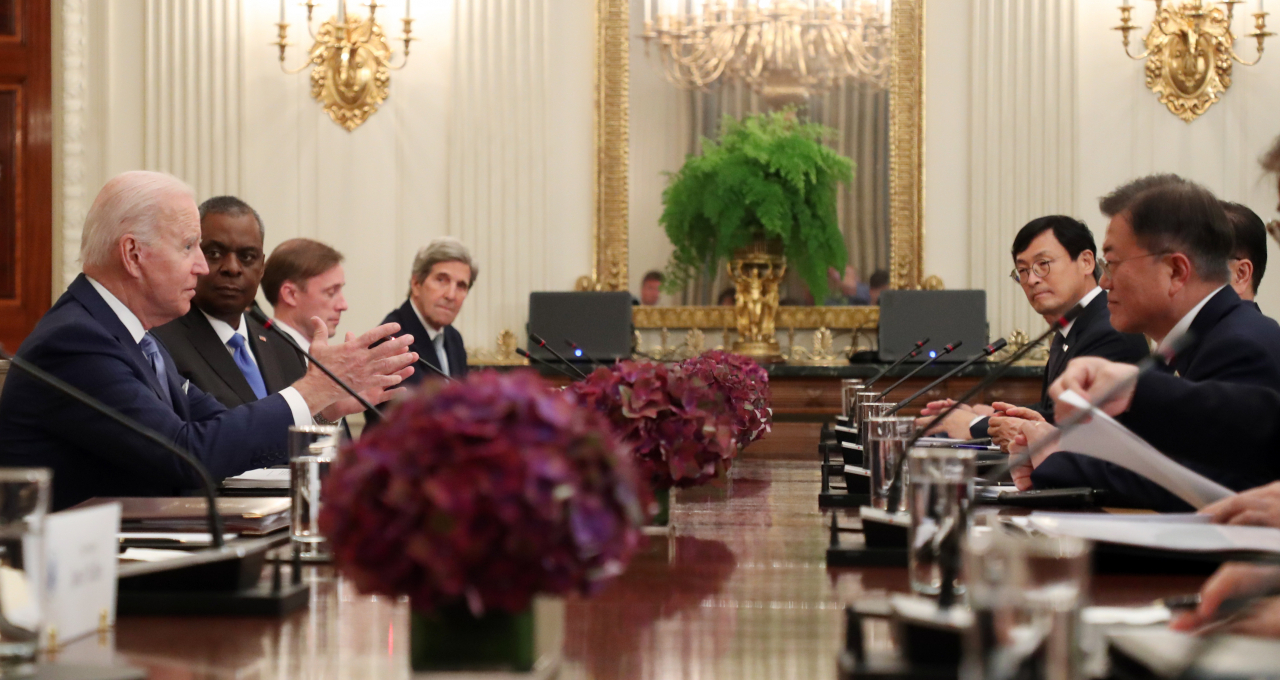 문재인 대통령과 조 바이든 미국 대통령이 21일 오후(현지시간) 백악관 국빈만찬장에서 확대회담을 하고 있다. 연합뉴스 |
