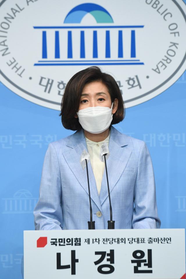 국민의힘 나경원 전 의원이 20일 오전 서울 여의도 국회 소통관에서 기자회견을 열고 국민의힘 대표 출마 기자회견을 하고 있다. 오대근 기자 |
