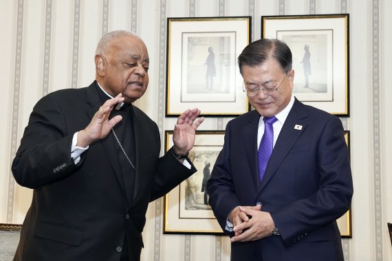 【김호연 기자·워싱턴DC=공동취재단】 미국을 공식 방문 중인 문재인 대통령은 22일(현지시간) 윌튼 그레고리 추기경 겸 워싱턴 대교구 대주교를 면담했다. 그레고리 추기경은 지난 2020년 10월 아프리카계 미국인으로서 최초로 추기경으로 임명됐으며 2019년 4월부터 워싱턴 D.C. 대교구 대주교직도 수임 중이다.