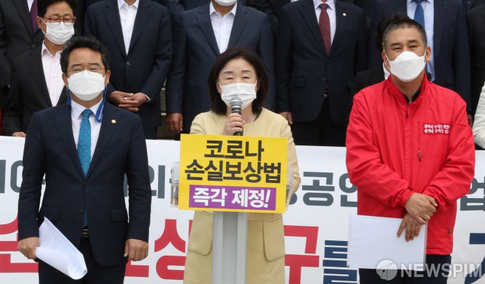[서울=뉴스핌] 최상수 기자 = 민병덕(왼쪽) 더불어민주당 의원, 최승재(오른쪽) 국민의힘 의원, 심상정 정의당 의원이 25일 오전 여야 국회의원, 소상공인 자영업자 신속한 손실보상 촉구를 위한 기자회견이 열린 서울 여의도 국회 본청 앞에서 기자회견문을 낭독하고 있다. 2021.05.25 kilroy023@newspim.com