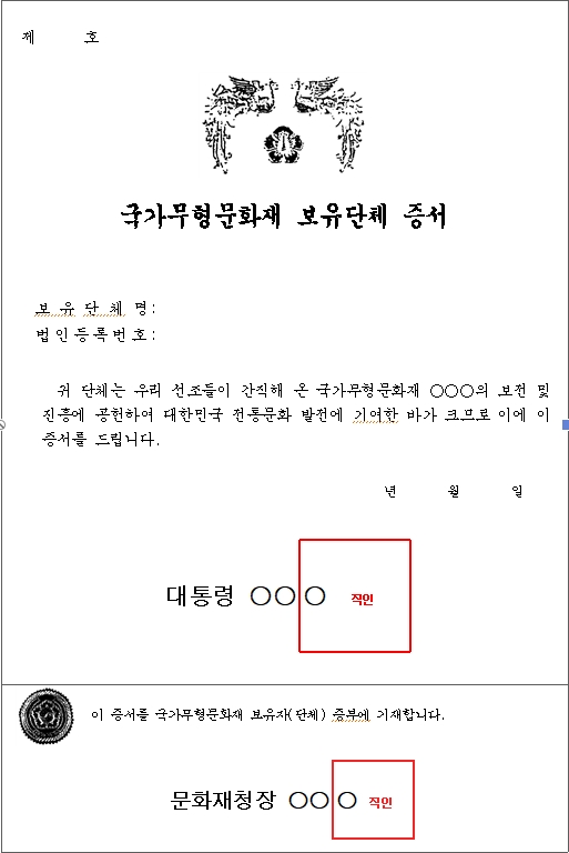 앞으로는 국가무형문화재 보유자와 보유단체에 문화재청장 명의 인정서와 함께 대통령 명의 증서가 별도로 수여된다. 문화재청은 이 같은 내용의 무형문화재 보전 및 진흥에 관한 법률 시행령을 25일 공포하고 내달 23일부터 시행한다.