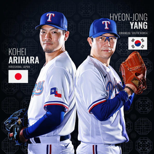 텍사스 레인저스 구단이 소개한 한국 출신의 양현종(오른쪽)과 아리하라 고헤이. (사진=텍사스 구단 트위터) *재판매 및 DB 금지 |