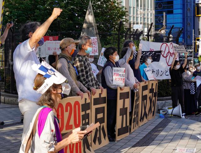 도쿄올림픽 개막 2개월을 앞둔 23일 일본 수도 도쿄의 번화가인 신주쿠에서 시위대가 피켓 등을 들고 올림픽 개최 취소를 요구하는 시위를 하고 있다. 도쿄올림픽은 7월 23일 개막 예정이다. 도쿄=EPA 연합뉴스 |