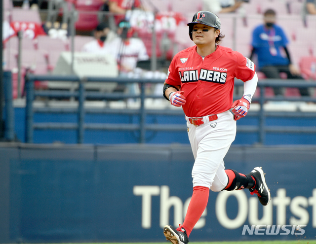 [광주=뉴시스]류형근 기자 = 19일 오후 광주 북구 광주-기아챔피언스필드에서 열린 2021프로야구 KIA 타이거즈 대 SSG 랜더스의 경기, 8회초 2사 만루에서 SSG 3번타자 추신수가 만루홈런을 친 뒤 운동장을 돌고 있다. 2021.05.19. hgryu77@newsis.com |