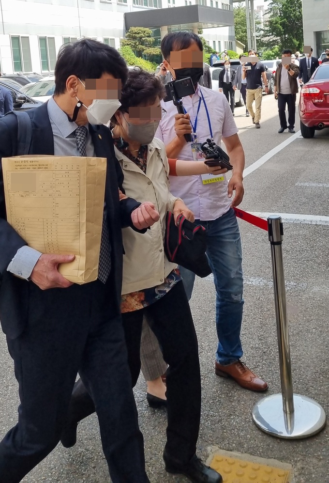 불법 요양병원을 운영하면서 요양급여 23억원 가까이 부정수급한 혐의(의료법 위반 등)로 기소된 윤석열 전 검찰총장의 장모 최모(74·가운데)씨가 지난 24일 의정부지법에서 열리는 재판을 받기 위해 변호인과 함께 법정에 들어가고 있다. 의정부=뉴시스 |