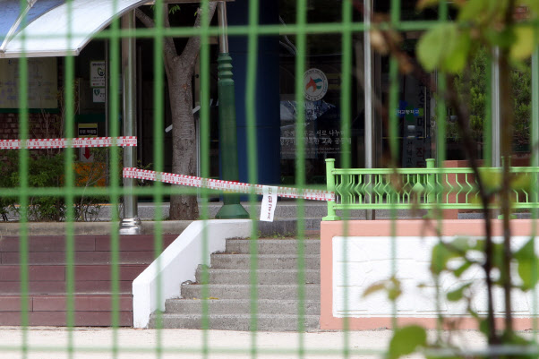 코로나바이러스 감염증(코로나19) 집단감염이 발생한 한 고등학교 교정에 출입 금지를 알리는 빨간 테이프가 둘러졌다. (사진=연합뉴스) |