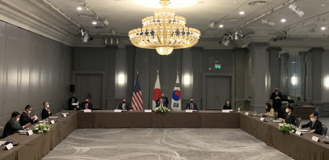 아시아투데이 하만주 워싱턴 특파원 = 문재인 대통령·조 바이든 미국 대통령·스가 요시히데(菅義偉) 일본 총리 간 한·미·일 정상회담이 추진되고 있다는 보도가 또 나왔다.