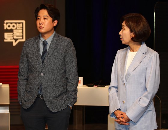국민의힘 당대표 선거에 출마한 이준석, 나경원 후보가 31일 저녁 서울 마포구 상암 MBC스튜디오에서 열린 100분토론회에서 대화를 나누고 있다. 뉴스1 |