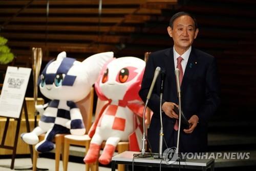 올림픽 마스코트 근처에서 회견하는 스가 총리 |