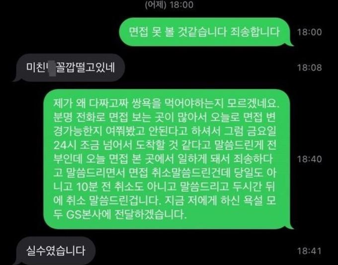 한 GS25 편의점 점주가 아르바이트를 지원하기 위해 연락한 면접생에게 문자로 욕설을 해 논란이 일고 있다.