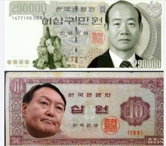 윤석열 전 검찰총장이 "저희 장모는 10원 한 장 피해 준 적 없다"는 발언을 비꼬는 패러디물. '전재산 29만원' 이라는 전두환 전 대통령에 빗대 10원짜리 지폐에 등장시켰다. SNS 갈무리 |