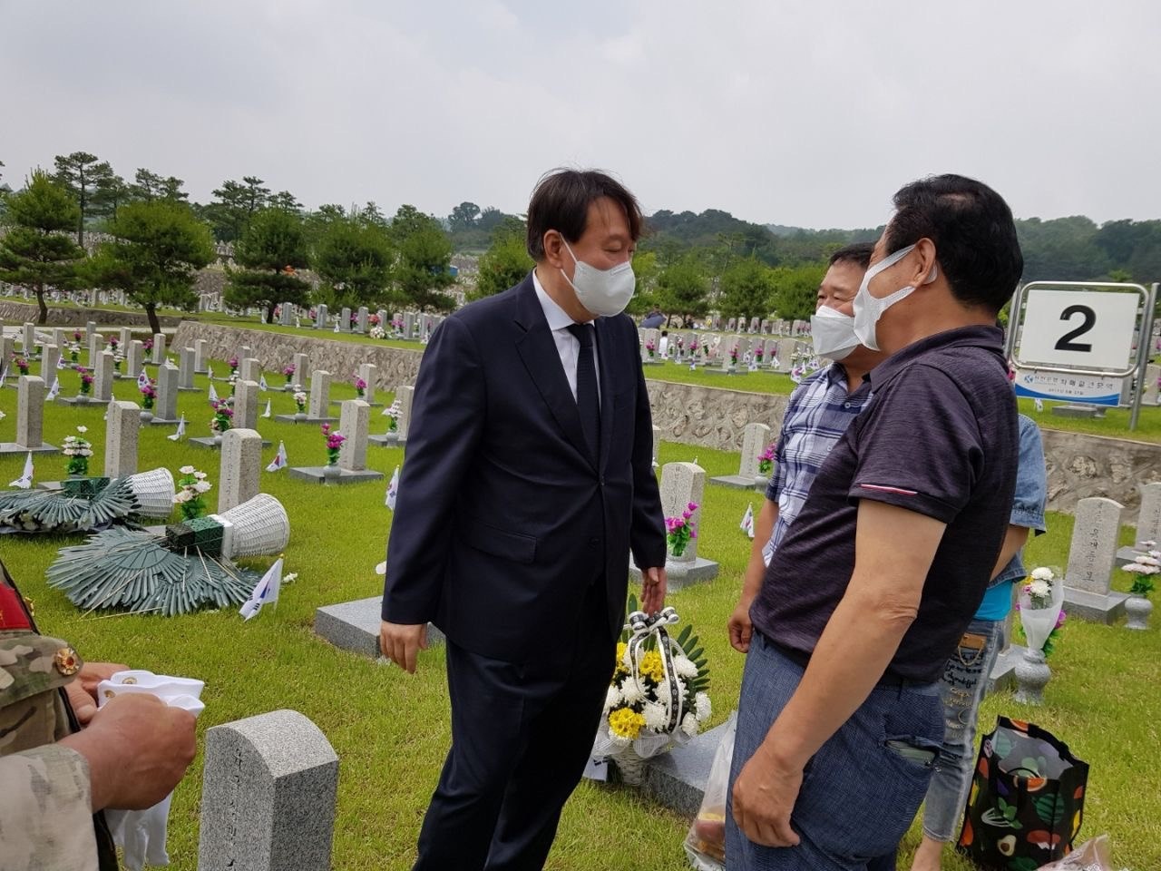 윤석열 전 검찰총장이 5일 현충원을 찾아 전사자 유족들과 대화하고 있다. [사진= 윤석열 전 검찰총장 측] |