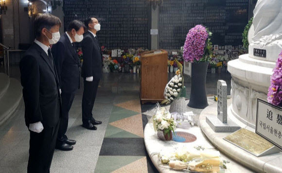 윤석열 전 검찰총장이 5일 오전 서울 동작구 국립서울현충원 충혼탑 지하 무명용사비와 위패봉안실을 찾아 참배하고 있다. 윤석열 전 검찰총장 측 제공 |