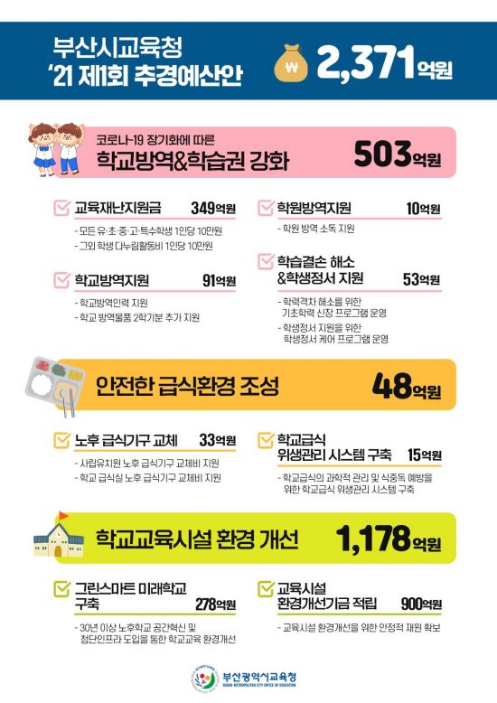부산시교육청은 학교방역 인력과 물품 지원, 학생들의 학습권 보장, 학습격차 해소 및 정서 지원, 안전한 급식환경 조성, 학교 교육시설 환경개선 등을 위한 예산을 반영했다.