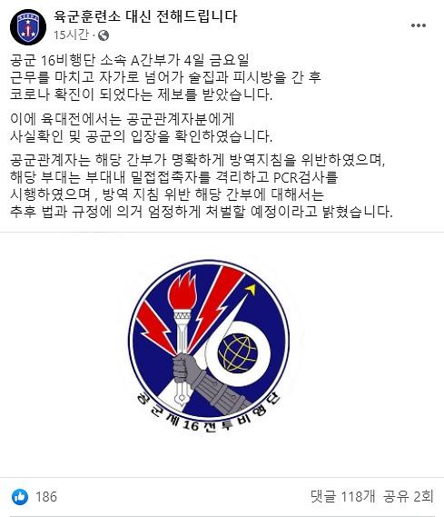 7일 페이스북 육군훈련소 대신 전해드립니다(육대전)에는 관련 제보가 접수됐다. 공군은 "사실 확인 결과 해당 간부가 명확하게 방역지침을 위반했다"고 알렸다.