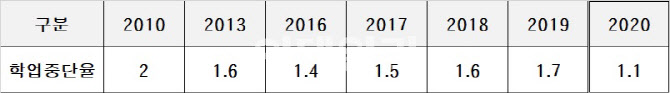 2010학년도~2020학년도 고등학교 학업중단비율 비교(자료: 종로학원) |