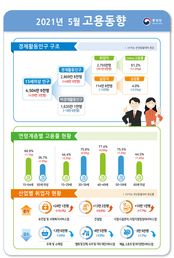 5월 실업자는 114만8000명으로 전년 같은 달보다 13만 명 감소했다. 실업률은 4.0%로 같은 기간 0.5%P 하락했다. 청년층 실업률은 9.3%로 같은 기간 0.9%P 하락했다.