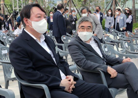 윤석열 전 검찰총장이 9일 오후 열린 서울 남산예장공원 개장식에 참석해 이철우 연세대 교수와 대화하고 있다. 지난 3월 4일 윤 전 총장이 검찰총장직을 사퇴한 지 3개월여 만의 첫 공식행사 참석이다. 사진=박범준 기자 |