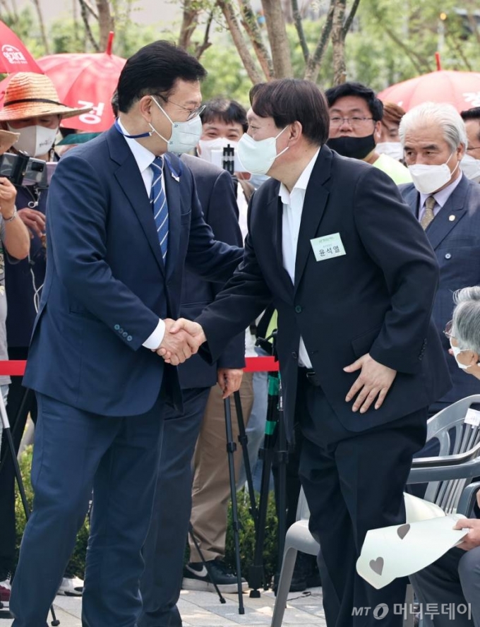 지난 9일 오후 서울 중구 남산예장공원 개장식에서 만난 송영길 더불어민주당 대표(왼쪽)와 윤석열 전 검찰총장(오른쪽)이 인사하고 있다. /사진제공=뉴스1 |