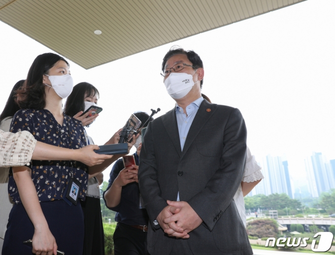 (과천=뉴스1) 신웅수 기자 = 박범계 법무부 장관이 10일 오전 경기 과천시 정부과천청사 내 법무부로 출근하며 취재진의 질의에 답변하고 있다. 박 장관은 이날 출근길에 검찰 직제개편안에서 형사부의 직접수사를 장관이 승인하도록 규정한 내용이 빠질 가능성에 대해 |