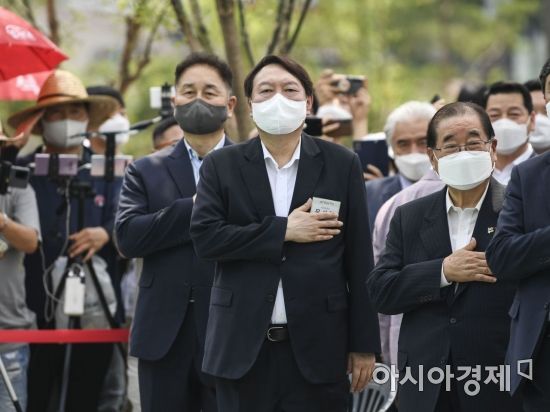 윤석열 전 검찰총장이 9일 서울 중구 남산예장공원 개장식 겸 이회영기념관 개장식에 참석, 국민의례를 하고 있다./윤동주 기자 doso7@ |