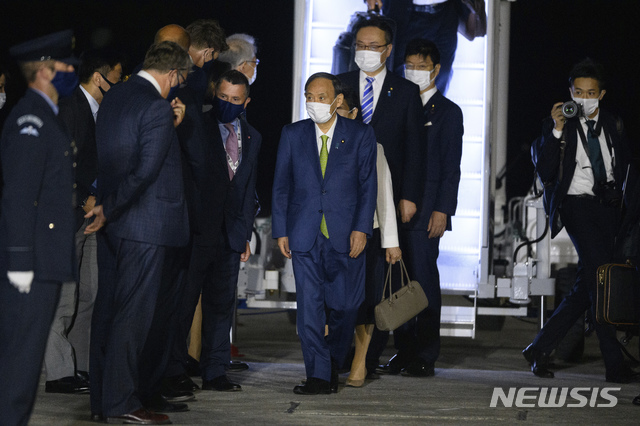 [뉴키=AP/뉴시스]스가 요시히데 일본 총리가 영국 콘월에서 열리는 주요 7개국(G7) 정상회의에 참석하기 위해 11일(현지시간) 뉴키 공항에 도착했다. 2021.06.11. |