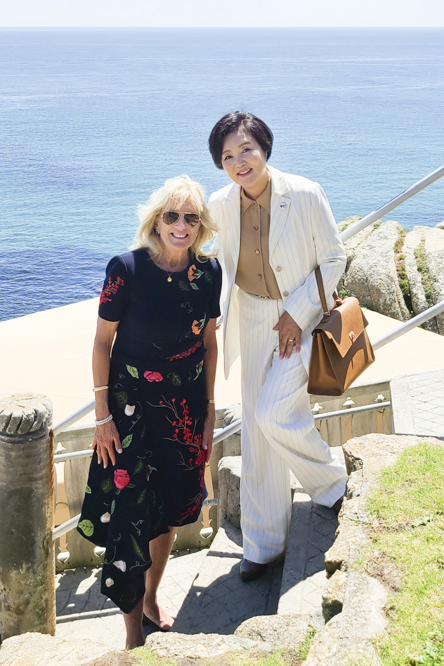 문재인 대통령과 함께 주요 7개국(G7) 정상회의가 열리는 영국을 방문 중인 김정숙 여사가 12일(현지시간) 스가 요시히데 일본 총리의 부인인 스가 마리코 여사를 만나 반갑다는 인사를 건넸다. 조 바이든 미국 대통령의 부인 질 바이든 여사는 지난달 한미정상회담에 김 여사가 불참하게 된 사실을 의식한 듯 미국 초청 의사를 내비쳤다.
