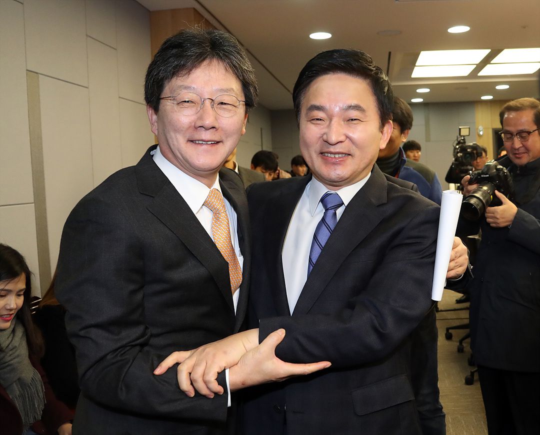 원희룡 제주도지사와 유승민 전 의원이 지난 2017년 1월 국회 의원회관에서 열린 개혁보수신당 창당추진회의에 참석, 포옹하며 인사하고 있다. |