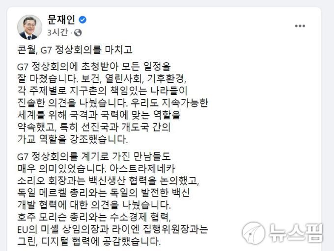 문 대통령은 이날 SNS를 통해 밝힌 '콘월, G7 정상회의를 마치고'라는 제목의 글에서 옥일 메르켈 총리, 호주 모리슨 총리, 프랑스 파크롱 대통령 등과 양자회담을 가진 것을 거론하며 이같이 말했다.