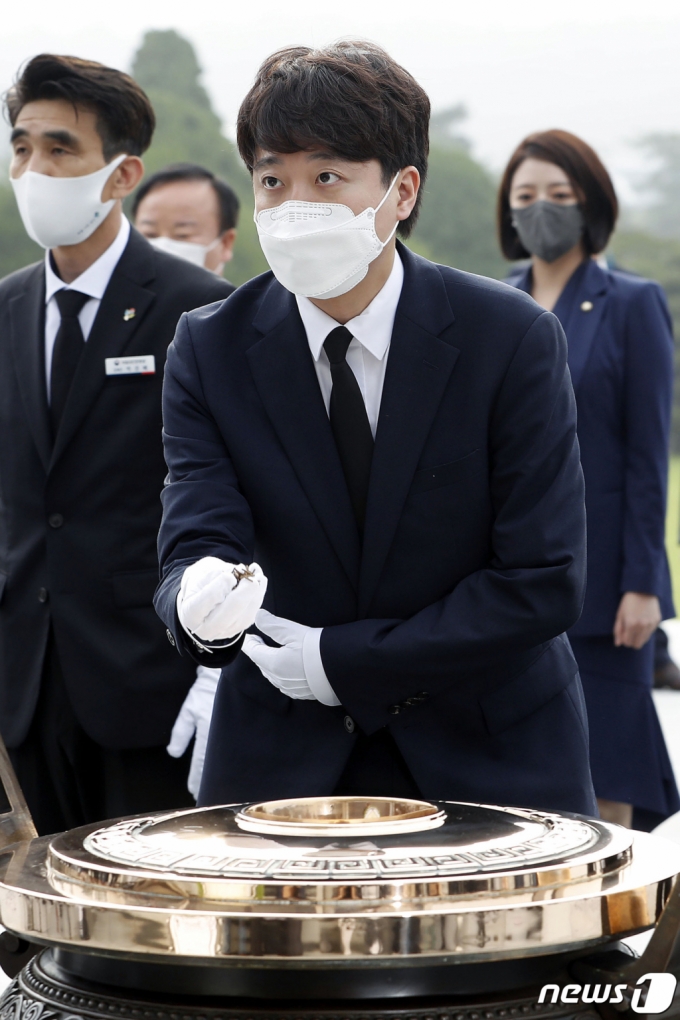 이준석 국민의힘 대표는 14일 대전 유성구 국립대전현충원을 찾아 현충탑에 분향했다. 2021.6.14/사진=뉴스1 |