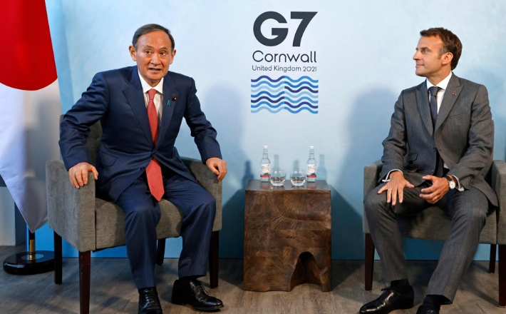 영국 콘월주 카비스 베이에서 열린 주요 7개국(G7) 정상회의에 참석 중인 스가 요시히데(왼쪽) 일본 총리와 에마뉘엘 마크롱 프랑스 대통령이 지난 12일(현지시간) 양자 회담을 하고 있다. 연합뉴스 |