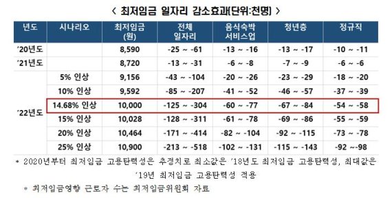 20%(1만464원) 인상시에는 최대 41만4000개의 일자리 손실이 예상되며, 특히 청년층 일자리가 최대 11만5000개 감소할 것으로 집계됐다.