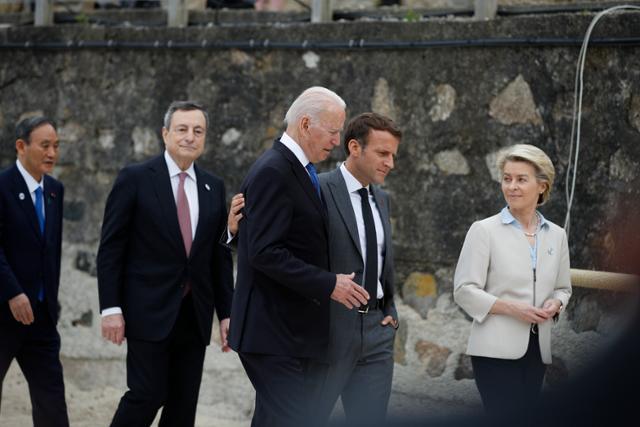 11일 조 바이든 미 대통령(가운데)과 에마뉘엘 마크롱 프랑스 대통령이 어깨를 맞대고 이야기를 나누며 걸어가고 있는 가운데 스가 요시히데(맨 왼쪽) 일본 총리는 묵묵히 뒤에서 따라오고 있다. 콘월=EPA 연합뉴스 |