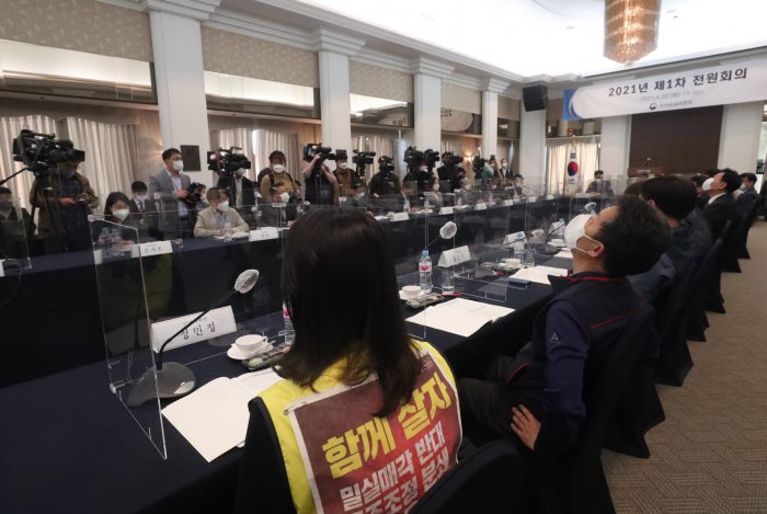 민주노총은 공익위원 교체와 한국노총과의 위원수 조정을 요청했지만 받아들여지지 않자 지난 2차 전원회의에 불참했어요. 민주노총은 기존 공익위원들이 2019년 2.87%, 2020년 1.5%의 낮은 최저임금 인상률 결정을 주도했다는 이유로 이들의 유임을 반대해왔습니다.
