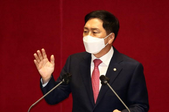 국민의힘 김기현 원내대표가 17일 서울 여의도 국회에서 열린 본회의에서 교섭단체 대표연설을 하고 있다. 연합뉴스 |