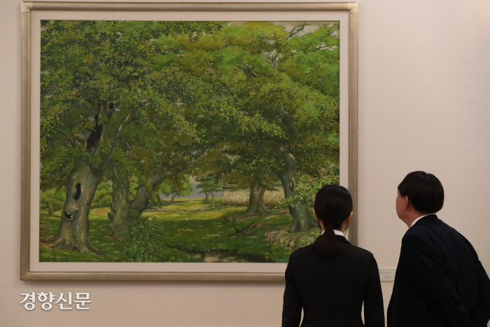 윤석열 전 검찰총장(오른쪽)이 2019년 7월 청와대 본관에서 열린 임명장 수여식에 참석해 부인 김건희씨와 함께 충무전실에 걸린 그림을 살펴보고 있다. 청와대사진기자단 |