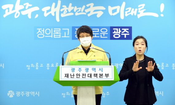 박향 광주광역시 복지건강국장이 코로나19 확진자 발생에 따른 브리핑을 하고 있다.사진=광주광역시 제공 |