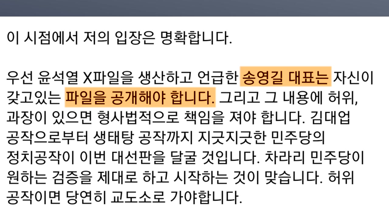 김 최고위원은 SNS를 통해 '윤석열 X파일'은 민주당 또는 그 언저리에서 시작됐다며 우선 송 대표는 자신이 가진 파일을 공개해야 한다고 주장했습니다.