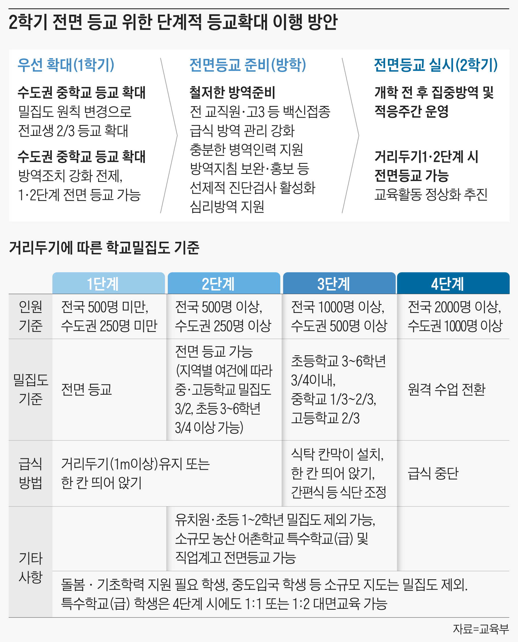 교육부 방안에 따르면, 오는 2학기부터는 거리 두기 1단계(확진자 500명 미만)와 2단계(500명~1000명 미만)인 경우 모든 학교에서 전면 등교를 실시한다. 단, 2단계 때는 지역 여건에 따라 제한적으로 등교·원격 수업을 병행할 수 있다. 학급당 학생 수가 평균 30명 이상인 과밀학교·학급이면 교사·학부모 등 학교 구성원 의견 수렴을 거쳐 하루 최대 등교 인원을 전교생의 4분의 3까지 허용할 수 있다는 의미다. 3단계(1000~2000명 미만)로 격상되면 모든 학교가 등교·원격 수업을 병행하게 된다. 4단계(2000명 이상)에선 등교를 중단하고 원격 수업으로 전환한다. 다만 유치원생, 초등 1·2학년, 고3, 소규모·특수학교는 거리 두기 3단계 이하까지 매일 등교할 수 있고, 교내 밀집도 기준(하루 최대 등교 인원)에서도 제외된다.
