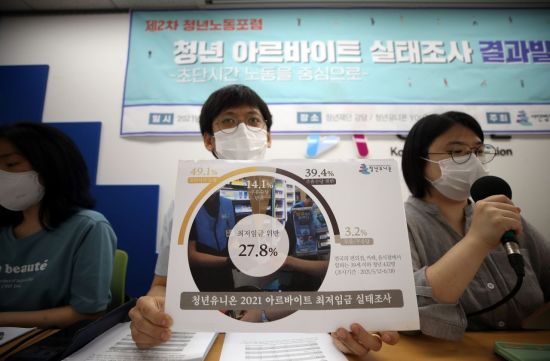 청년유니온은 전국의 아르바이트 노동자 432명을 대상으로 이달 중순까지 한 달여에 걸쳐 노동 조건을 조사해 분석한 내용을 21일 발표했다. 응답자들은 평균 8985원을 시급으로 받고 한 주에 19.1시간 일했다.