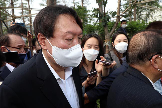 윤석열 전 검찰총장이 지난 6월 9일 서울 중구 남산예장공원에서 열린 독립운동가 우당 이회영 선생 기념관 개관식에 참석해 기념관으로 이동 중 취재진의 질문을 듣고 있다. /조선일보DB |
