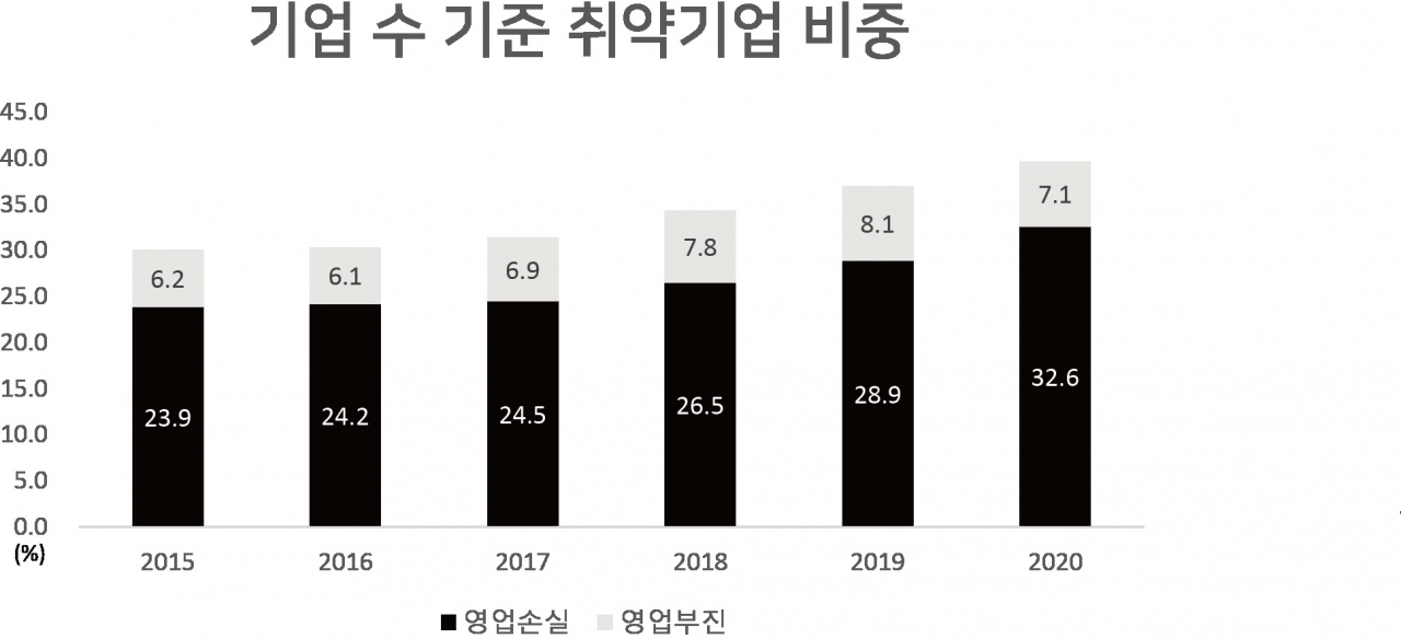 한계기업 증가 원인은 수익성 악화다. 지난해 기업의 총자산영업이익률(총자산 대비 영업이익)은 1.9%로 전년(2.2%)보다 더 낮아졌으며, 2010년(4.7%)과 비교하면 반토막 났다.