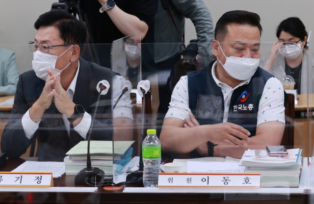 류기정(왼쪽) 한국경영자총협회 전무와 이동호 한국노동조합총연맹 사무총장이 22일 정부세종청사에서 열린 최저임금위원회 제4차 전원회의에서 서로 다른 쪽을 바라보고 있다. 24일 노사 양측의 최초 요구안이 공개될 예정인 가운데 경영계는 동결, 노동계는 1만 원 이상의 대폭 인상을 요구하고 있다. /세종=연합뉴스
