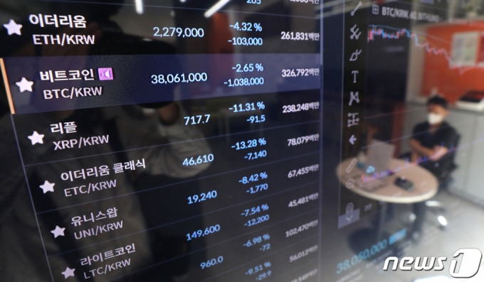 (서울=뉴스1) 임세영 기자 = 중국의 암호화폐(가상화폐) 채굴장 전면 폐쇄 여파로 비트코인 가격이 급락하고 있는 가운데 22일 오전 서울 강남구 빗썸 강남고객센터에 비트코인을 비롯한 암호화폐 시세가 표시되고 있다. 2021.6.22/뉴스1 |