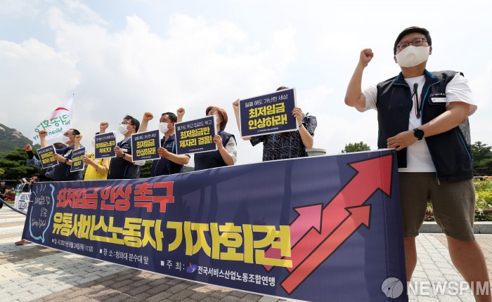 [서울=뉴스핌] 정일구 기자 = 전국서비스산업노동조합연맹(서비스연맹) 관계자들이 24일 오전 서울 종로구 청와대 분수대 앞에서 최저임금 인상 촉구 유통서비스노동자 기자회견을 열고 구호를 외치고 있다. 2021.06.24 mironj19@newspim.com